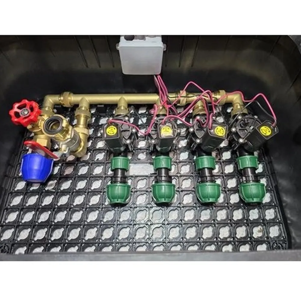 O distribuci vody se stará mosazný holendrový rozdělovač a jako hlavní uzávěr je integrován 1" sedlový ventil s odvodněním. Hydrant s 1" pákovým ventilem a Geka koncovkou slouží jako zdroj vody nebo připojení pro kompresor při zazimování. Součástí balení jsou také čtyři elektromagnetické ventily Rain Bird 100-DV-MM 9 V/DC, které ovládají automatické řízení průtoku vody v jednotlivých sekcích závlahy.