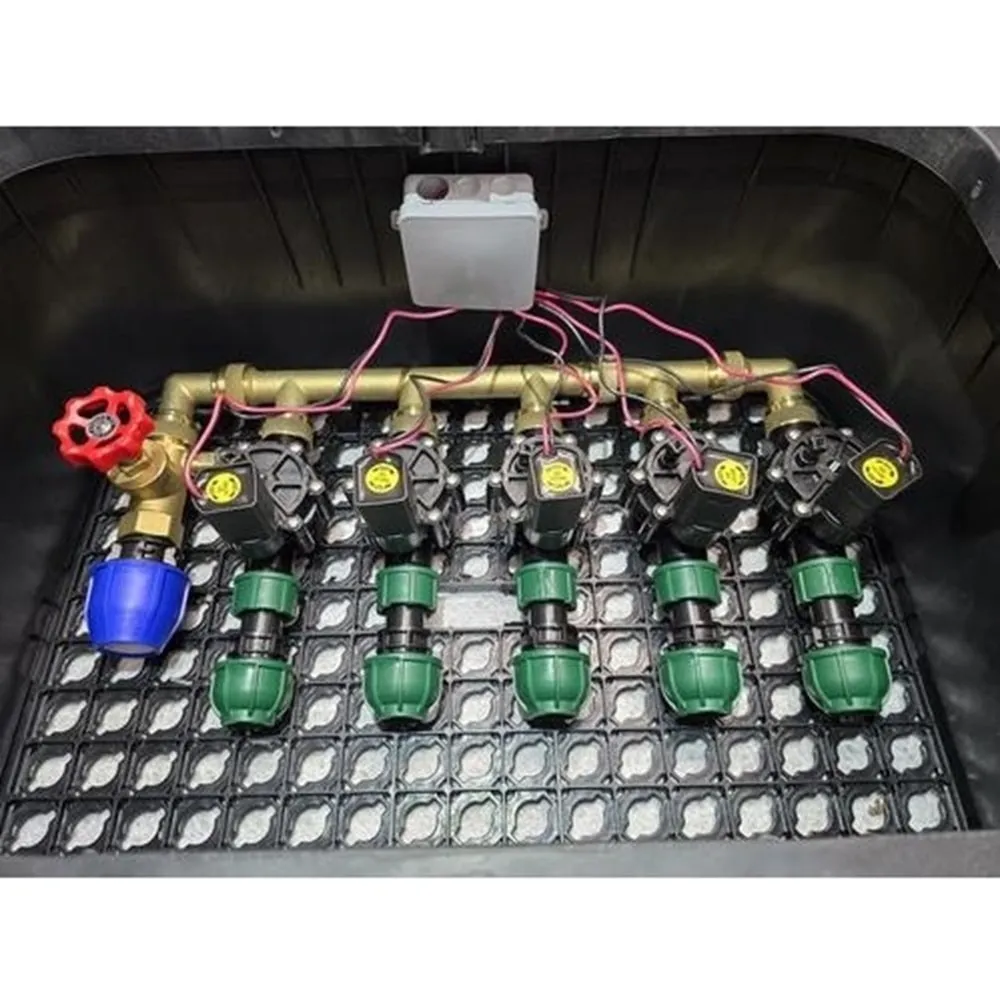 O distribuci vody se stará mosazný holendrový rozdělovač a jako hlavní uzávěr je integrován 1" sedlový ventil s odvodněním. Součástí balení je také pět elektromagnetických ventilů Rain Bird 100-DV-MM 9 V/DC, které ovládají automatické řízení průtoku vody v jednotlivých sekcích závlahy.