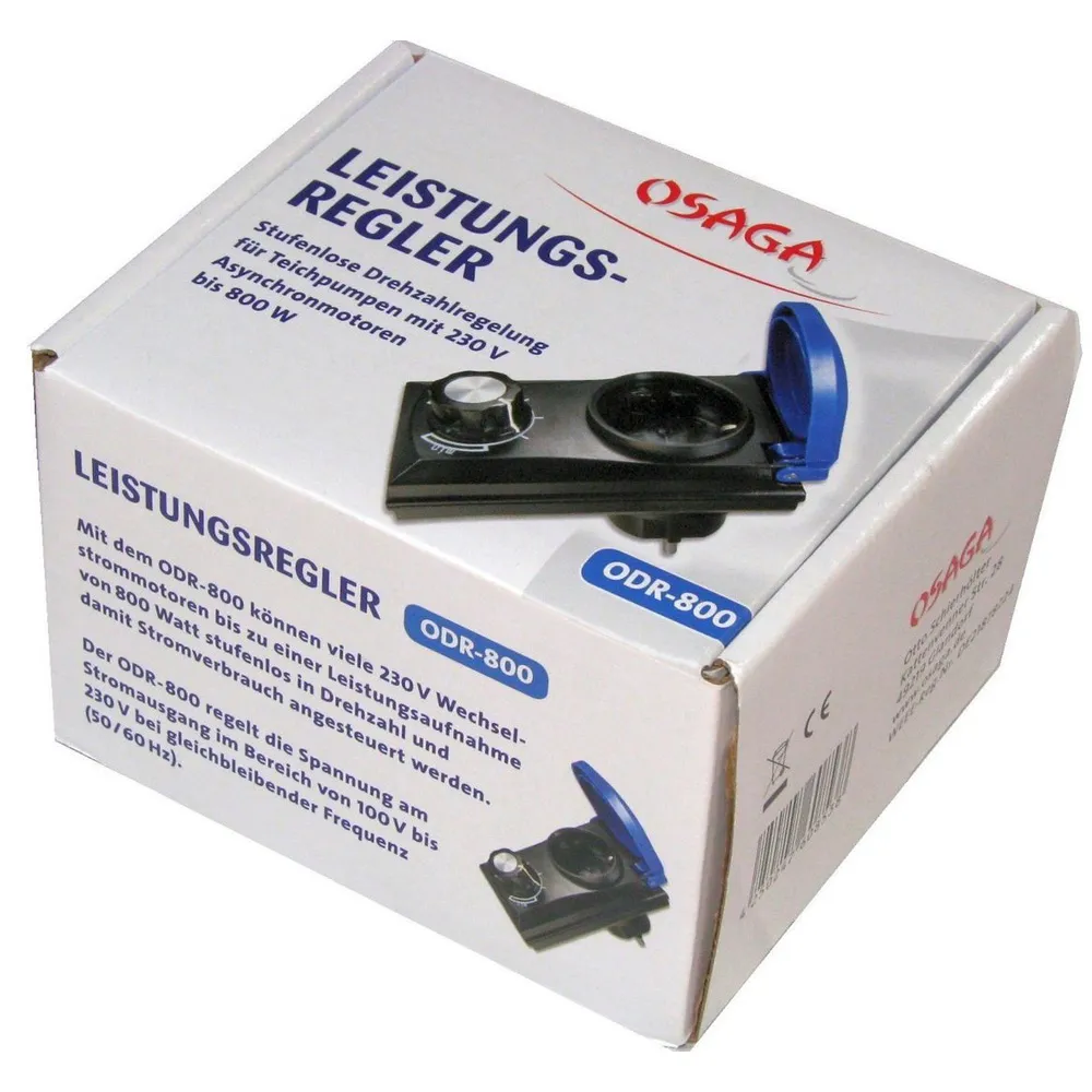 Regulátor výkonu ODR-800 slouží k plynulé regulaci asynchronních čerpadel a osvětlení do maximálního příkonu 800 W. Pomocí otočného potenciometru lze jednoduše upravit výkon připojeného zařízení podle aktuální potřeby, a tím přizpůsobit průtok vody nebo intenzitu světla.