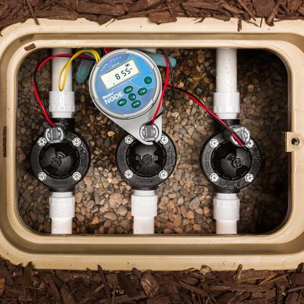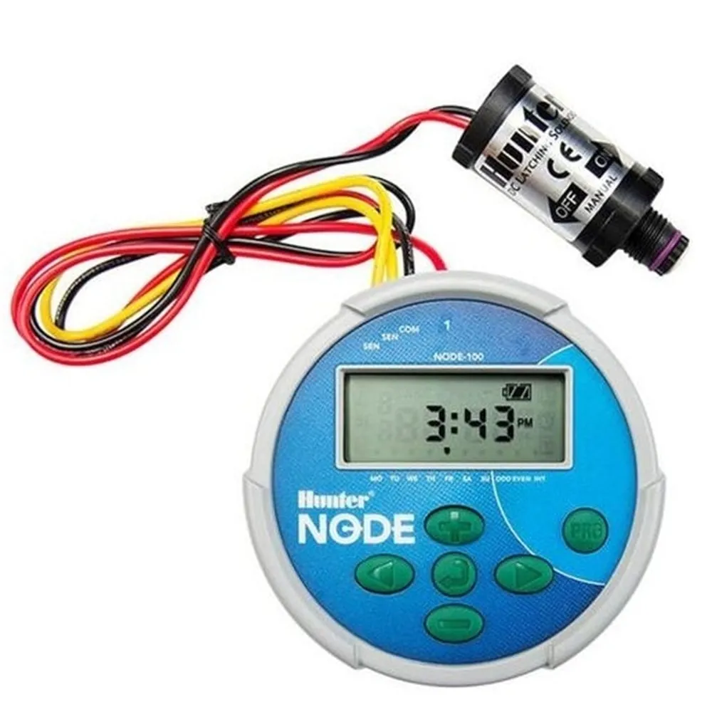 Hunter NODE 100 je profesionální vodotěsná řídicí jednotka, navržená pro zavlažovací systémy bez přívodu elektřiny. Umožňuje řízení jedné sekce přes tlačítka a LCD displej. Disponuje ochranným krytí IP68 a je vhodná pro instalaci do vlhkého prostředí, ať už na zahradách, sportovištích nebo veřejných plochách, tak i do interiéru (dům, garáž, zahradní domek).