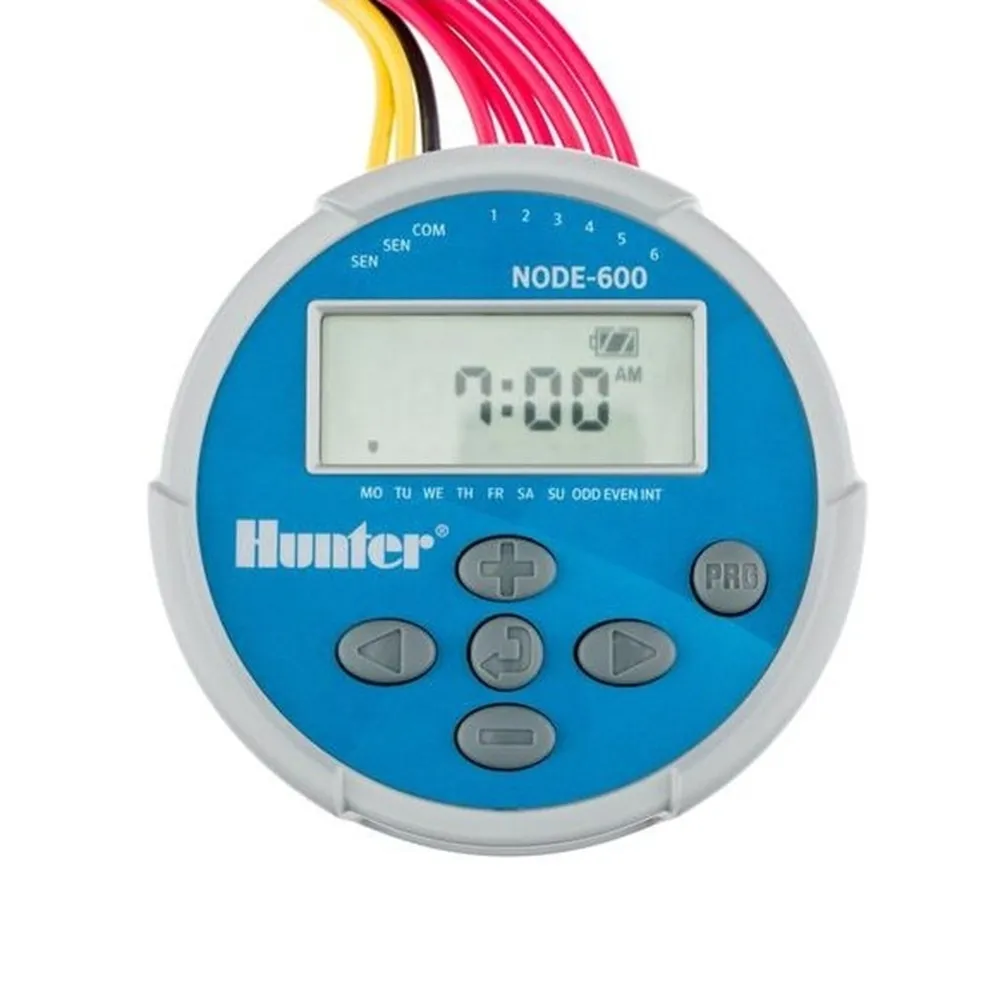 Hunter NODE 600 je profesionální vodotěsná řídicí jednotka, navržená pro zavlažovací systémy bez přívodu elektřiny. Umožňuje  řízení šesti sekcí přes tlačítka. Disponuje ochranným krytí IP68 a je vhodná pro instalaci do vlhkého prostředí, ať už na zahradách, sportovištích nebo veřejných plochách, tak i do interiéru (dům, garáž, zahradní domek).