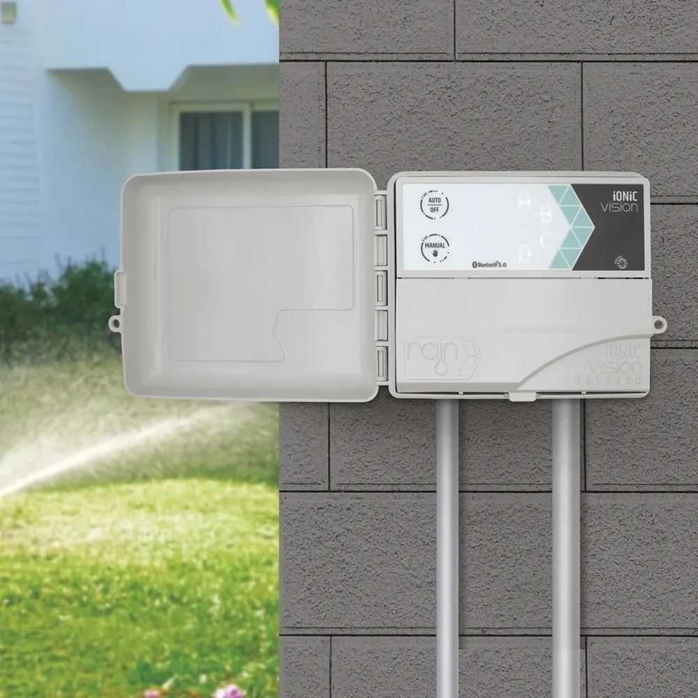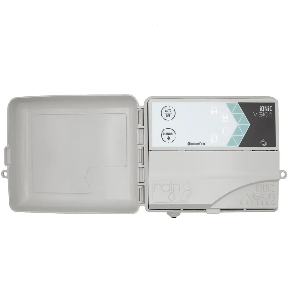 Rain IONIC Vision Outdoor je robustní nástěnná řídicí jednotka určená pro 8 sekcí v exteriéru. Je vybavena interním transformátorem a odolnou konstrukcí, takže nabízí spolehlivý provoz i v náročných podmínkách. Ovládání probíhá přes Bluetooth 5.0 pomocí aplikace Rain Vision, případně na dálku přes Wi-Fi díky integrovanému modulu Nuvola Mini, který lze instalovat i externě jako rozšíření domácí sítě.