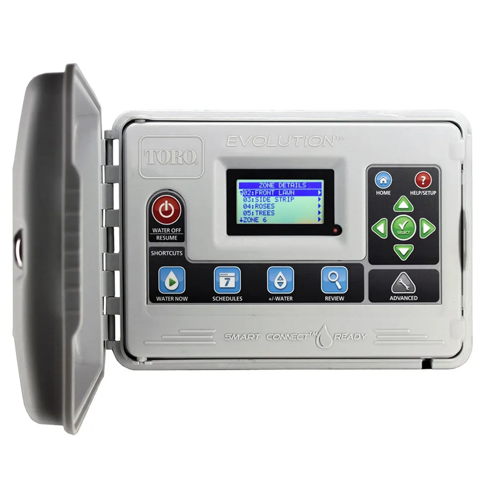 Toro Evolution pro venkovní použití je řídicí jednotka určená pro zavlažování jak menších závlahových systémů obytných domů, tak i větších veřejných prostranství a parků. V základní konfiguraci ovládá 4 sekce, přičemž díky modulárnímu systému ji lze rozšířit až na 16 sekcí pomocí rozšiřujících modulů EMOD-4 a EMOD-12. Nabízí přehledný displej s jednoduchým ovládáním pro běžné uživatele a zároveň řadu funkcí, které ocení i profesionálové.