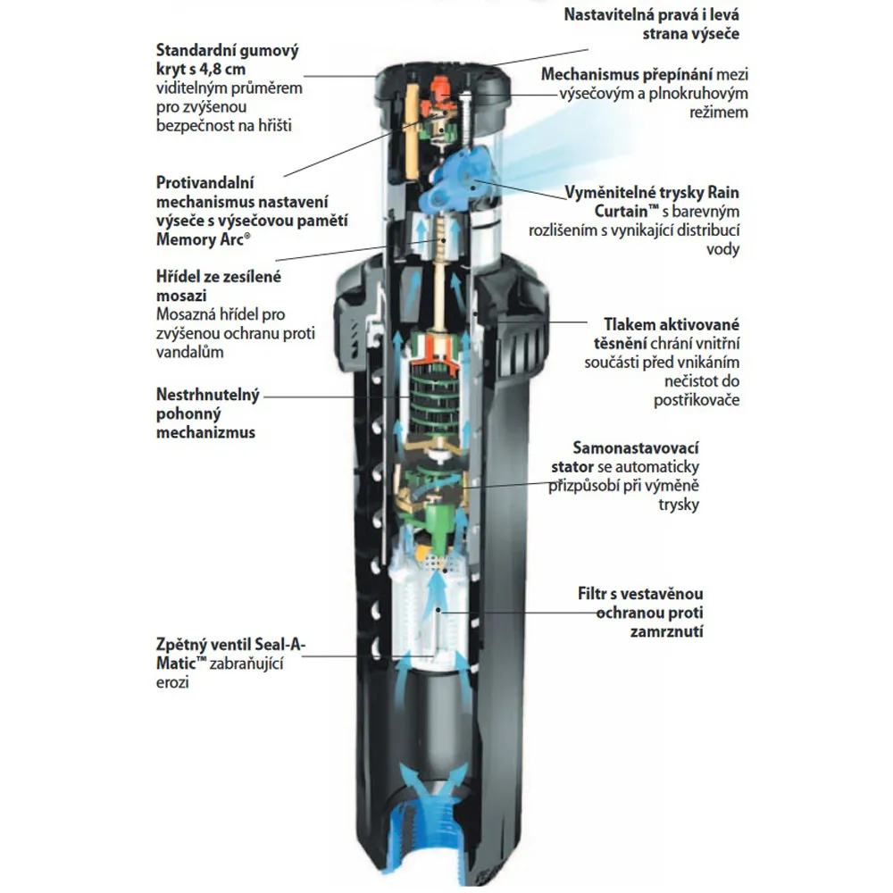 • Otočná část výsuvníku a vlastní výsuvník jsou spojeny masivní mosaznou hřídelí, což postřikovači poskytuje vysoce nadstandardní odolnost proti bočnímu nárazu.