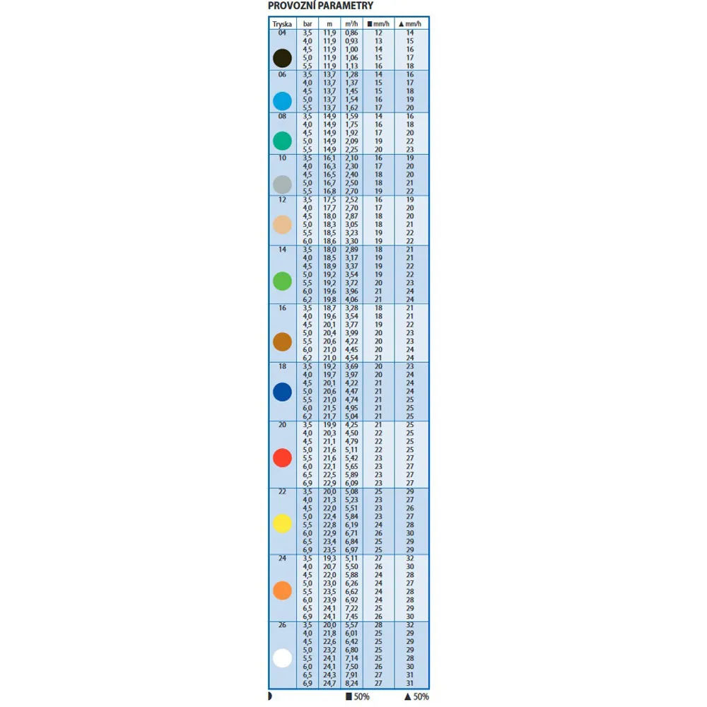 Rotační postřikovač s nastavitelnou výsečí od 50° do 330° částečný kruh, 360° nereverzní celý kruh. Plný a částečný provoz v jedné jednotcenebo 360° je dodáván včetně zpětného ventilu SAM a s předinstalovanou tryskou č. 18. Rozsah dostřiků od 11,9 m do 24,7 m.