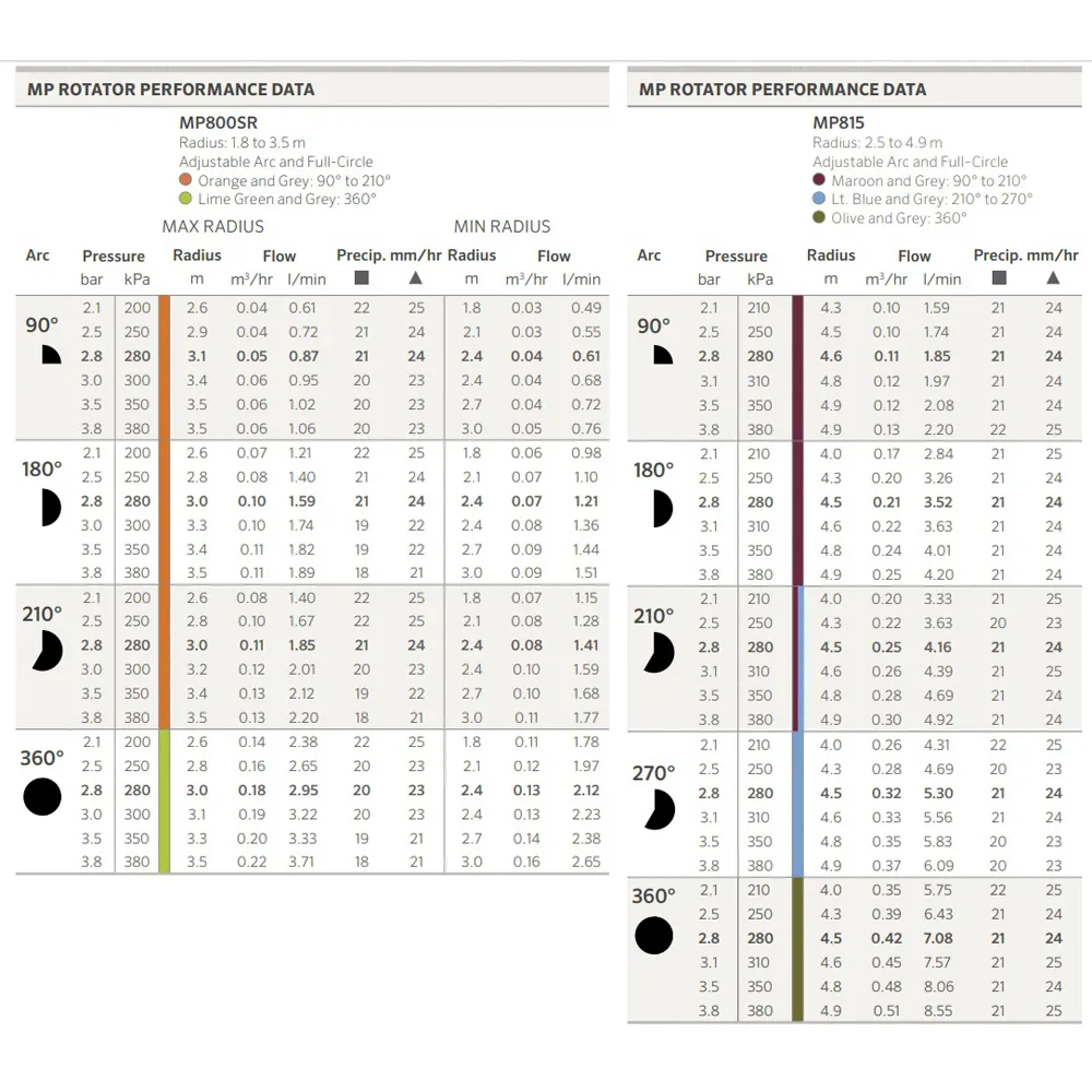 MP Rotator 815-360 je plně kompatibilní s těly postřikovačů ECO ROTATOR, PRO-SPRAY včetně verzí s regulací tlaku PRS40 a PRS30, které zajistí ideální pracovní tlak 2,8 bar. Díky jednotné srážkové výšce lze na jedné sekci kombinovat více modelů série MP800 bez rizika nerovnoměrného zavlažování.