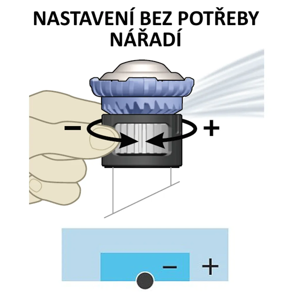 • Velikost postřikované výseče ale i dostřik trysky lze velmi snadno nastavit pouze rukou - bez nutnosti používat jakékoliv nástroje. Instalace je tak daleko jednodušší a rychlejší.