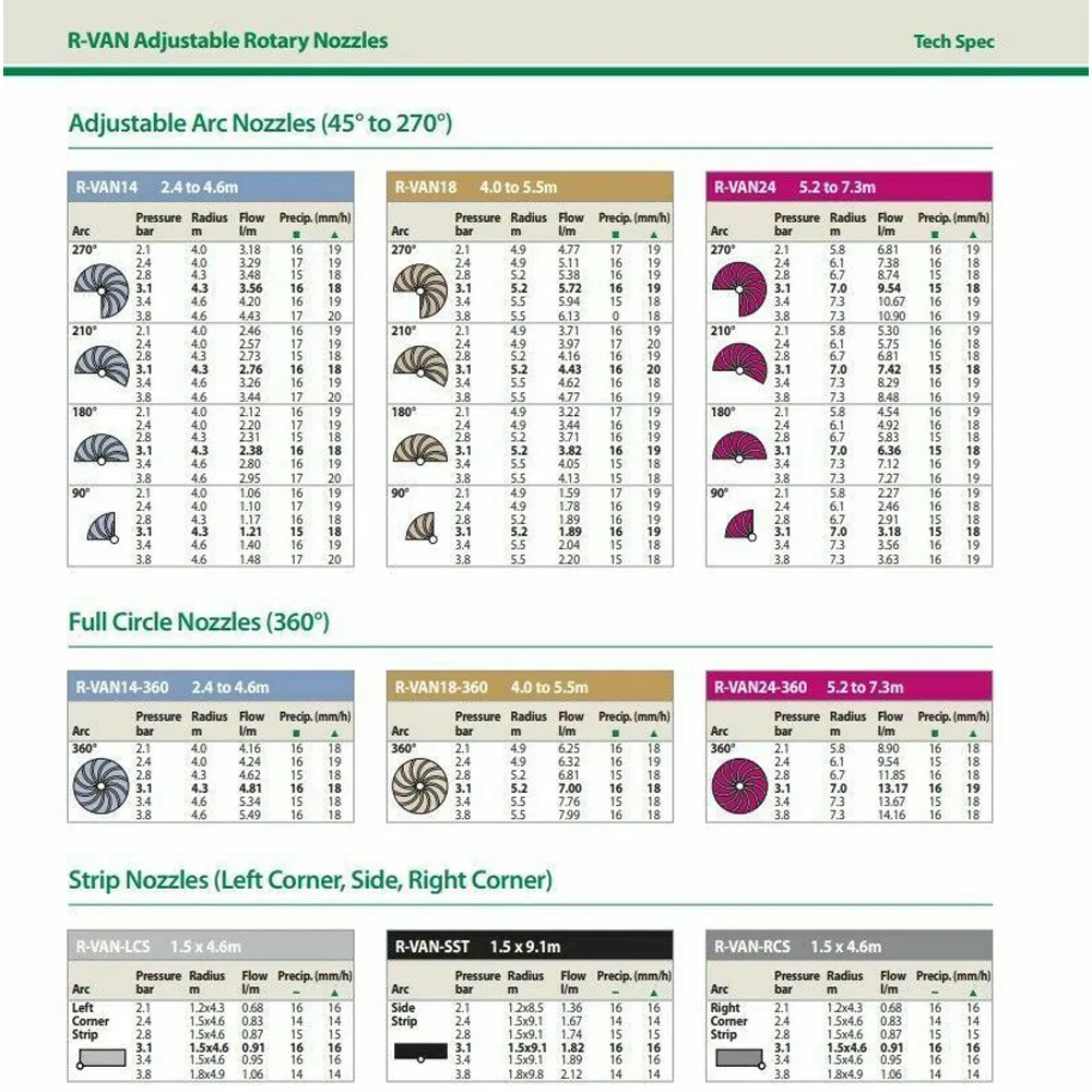 • Trysky R-VAN Adjustable Rotary Nozzles s rotujícími paprsky mají vynikající rovnoměrnost pokrytí, mají velmi nízkou intenzitu postřiku (srážkovou výšku) a tím významně snižují hodnoty povrchového odtoku a omezují tak na svažitých plochách a na těžších půdách erozi.
