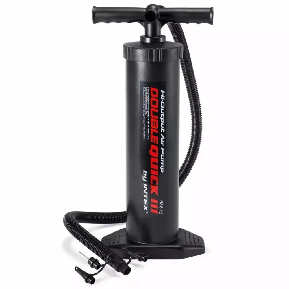 Ruční pumpa Intex Double Quick III je určená pro rychlé nafukování i vyfukování matrací, lehátek, člunů, míčů a dalšího nafukovacího vybavení. Díky dvoučinnému systému vhání vzduch při stlačení i při tahu nahoru, což výrazně zrychluje nafukování a šetří námahu.