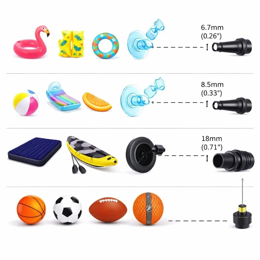 Pumpa má stabilní konstrukci s opěrnou základnou, která umožňuje bezpečné postavení na zem během pumpování. Praktická rukojeť a výška 48 cm zajišťují pohodlnou práci doma, na dovolené i při kempování. Součástí balení jsou 4 vyměnitelné nástavce.