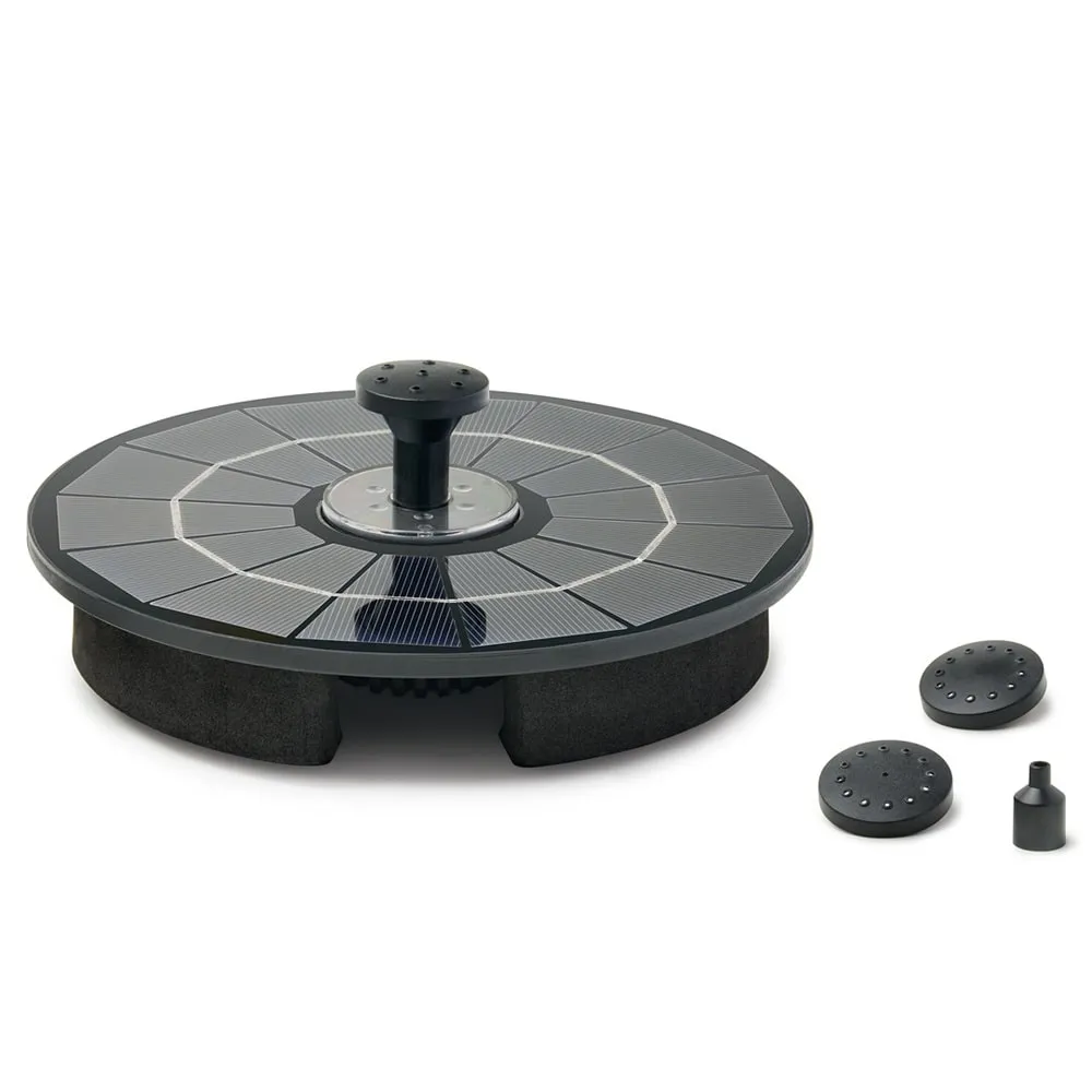 Balení obsahuje čerpadlo s výkonem 180 l/h, čtyři různé nástavce na trysky, solární panel s výkonem 2,5 W a lithium-polymerovou baterii 3,7 V / 600 mAh