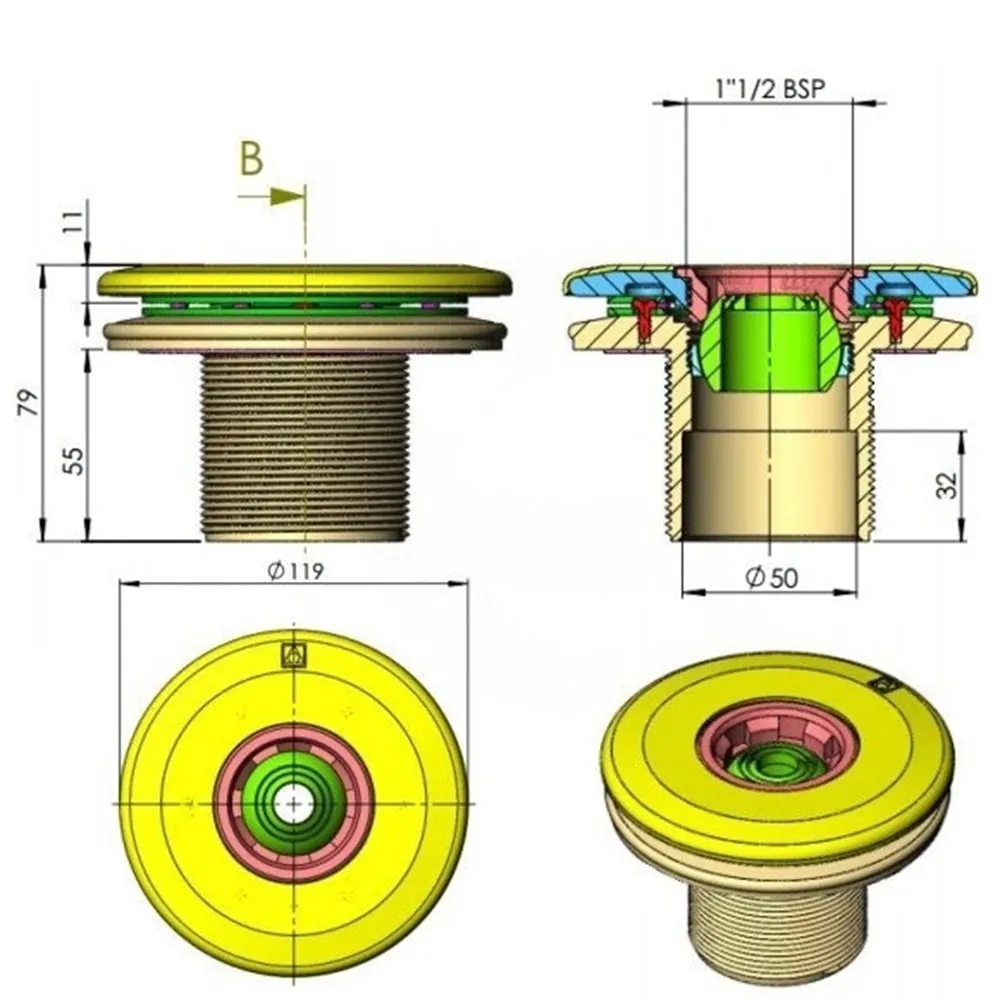 Recirkulační bazénová tryska je určena pro zajištění efektivní cirkulace vody v  bazénech. Slouží k návratu přefiltrované vody zpět do bazénu, čímž přispívá k rovnoměrnému promíchání vody a zabraňuje vzniku mrtvých zón bez cirkulace.