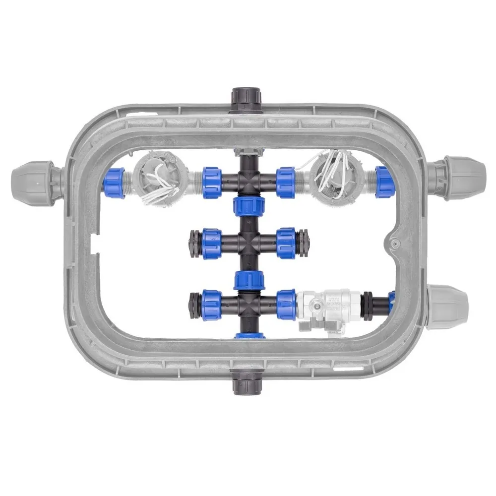 T-BOX sestava pro 4 ventily pro rozvod vody v závlahových systémech. Umožňuje rychlou montáž 1" ventilů a snadné budoucí rozšíření až n...