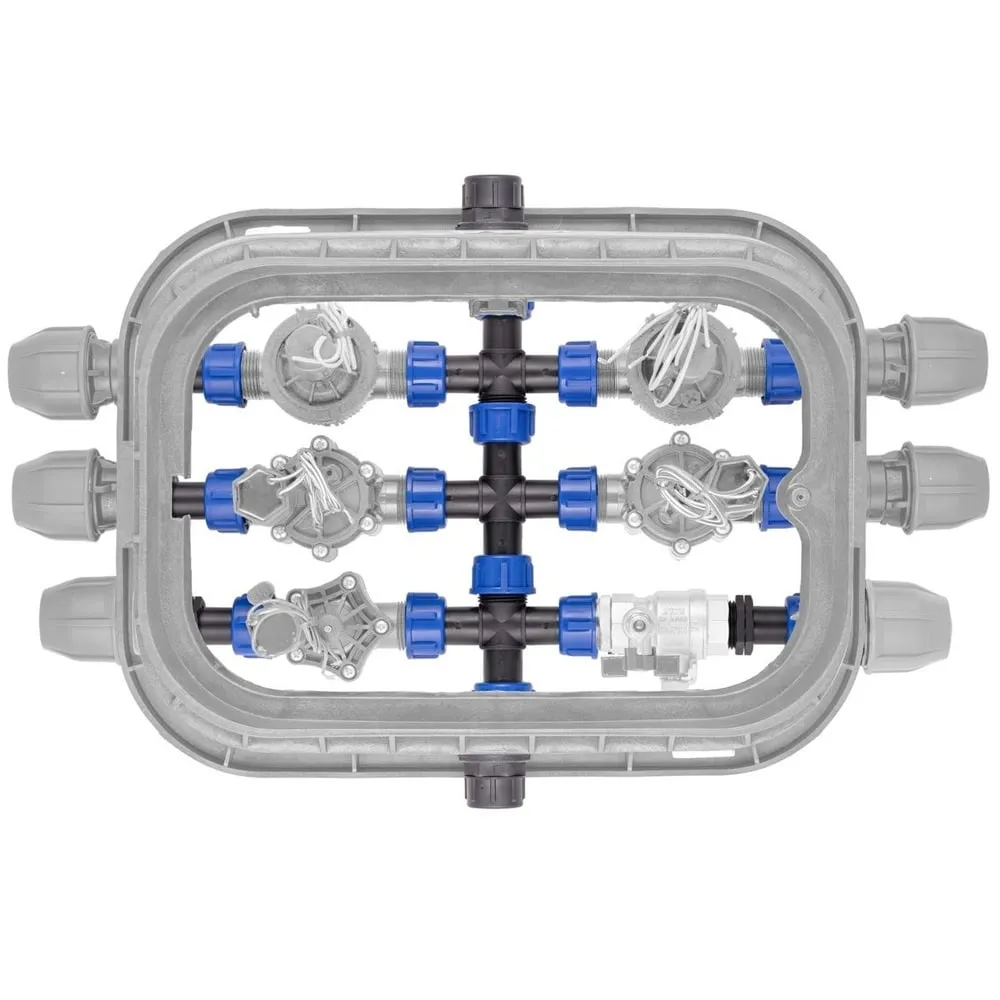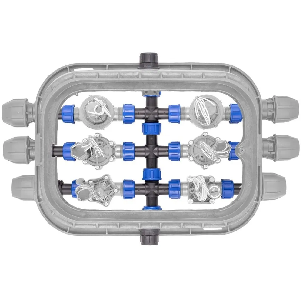 T-BOX sestava pro šest ventilů pro rozvod vody v závlahových systémech. Umožňuje rychlou montáž 1" ventilů a snadné budoucí rozšíření až na 6 ventilů.