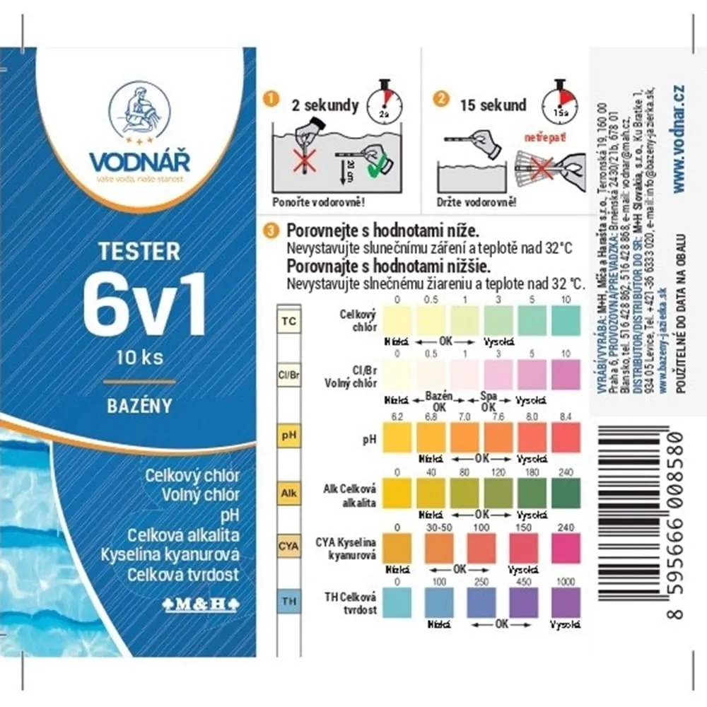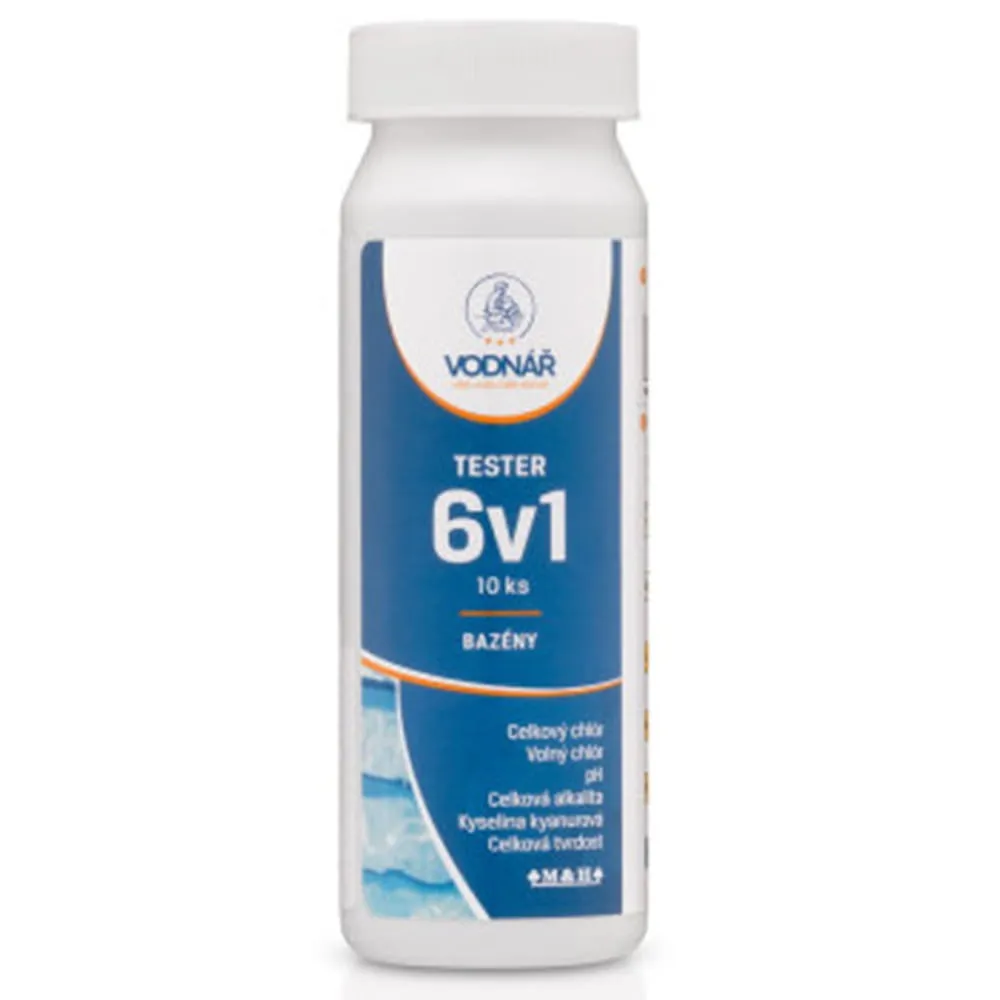 Vodnář Tester 6v1 je praktický pomocník pro pravidelnou kontrolu kvality bazénové vody. Pomocí jednoho testovacího proužku změříte celkový chlor, volný chlor, pH, celkovou alkalitu, kyselinu kyanurovou a celkovou tvrdost.