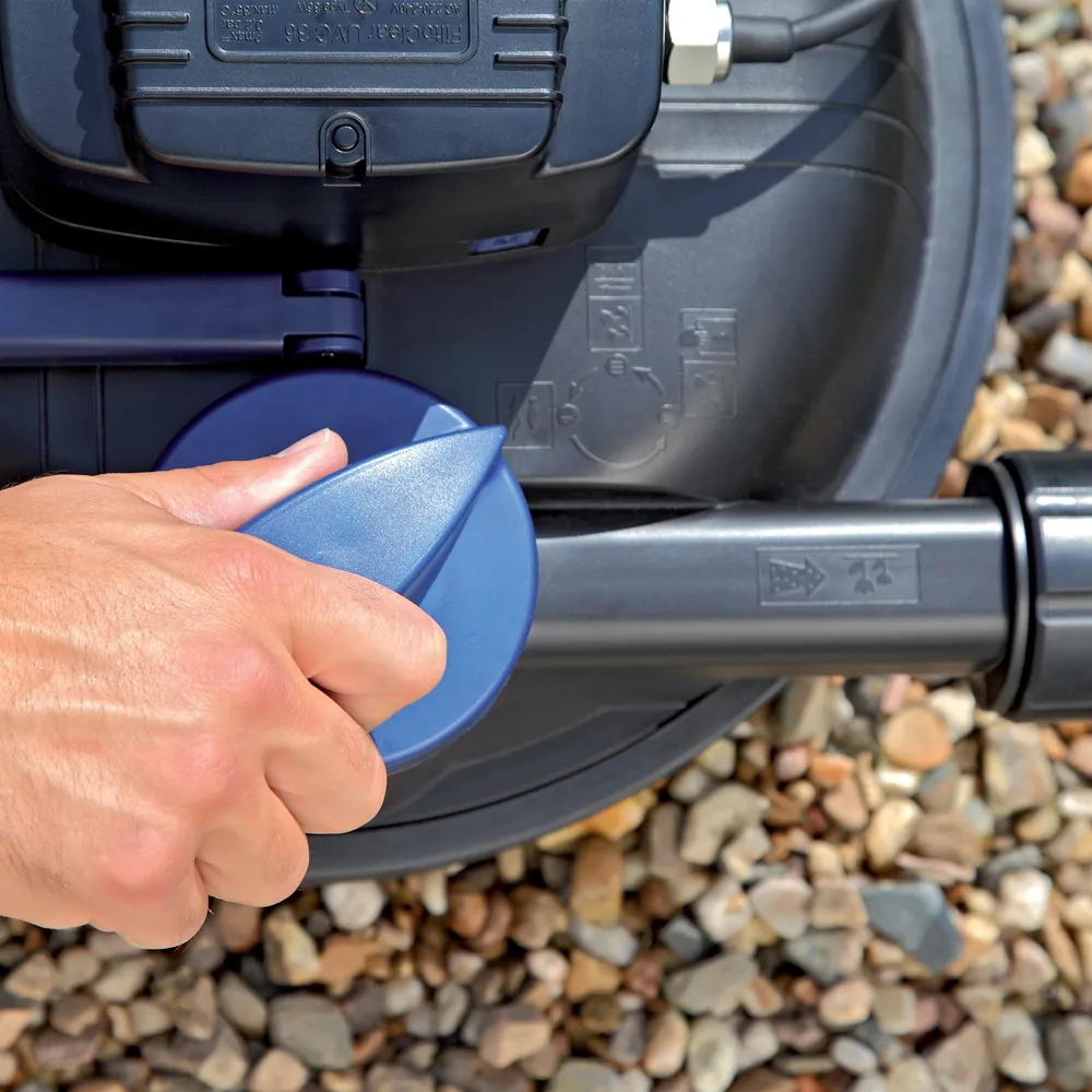 Nesmírnou výhodou je dvoucestný ventil, který umožňuje přepnutí proudění vody do jezírka nebo do odpadu. Již žádný zpětný průplach špinavé vody zpět do jezírka.