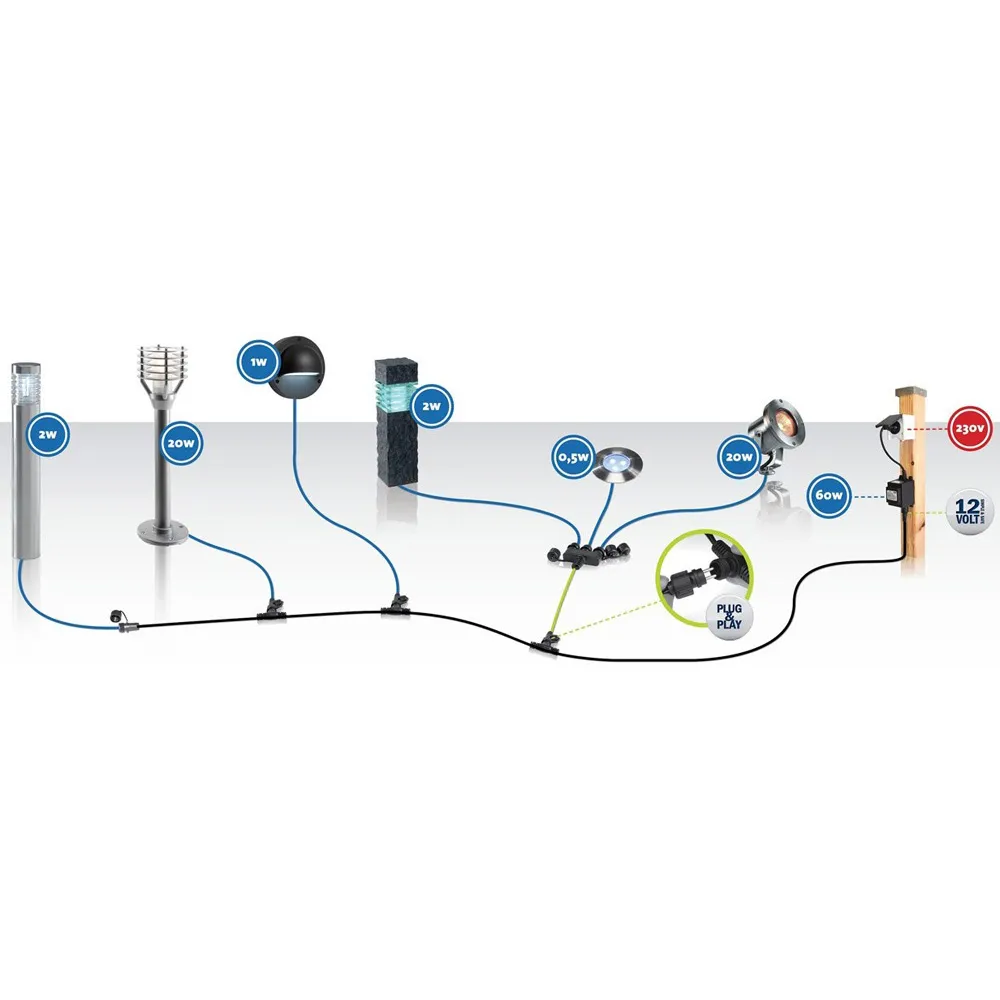 Transformátor se zapojuje přímo do zásuvky a slouží jako zdroj napájení pro celý 12 V systém Garden Lights. Jednotlivé prvky se propojují pomocí konektorů, takže instalaci zvládnete snadno i svépomocí.