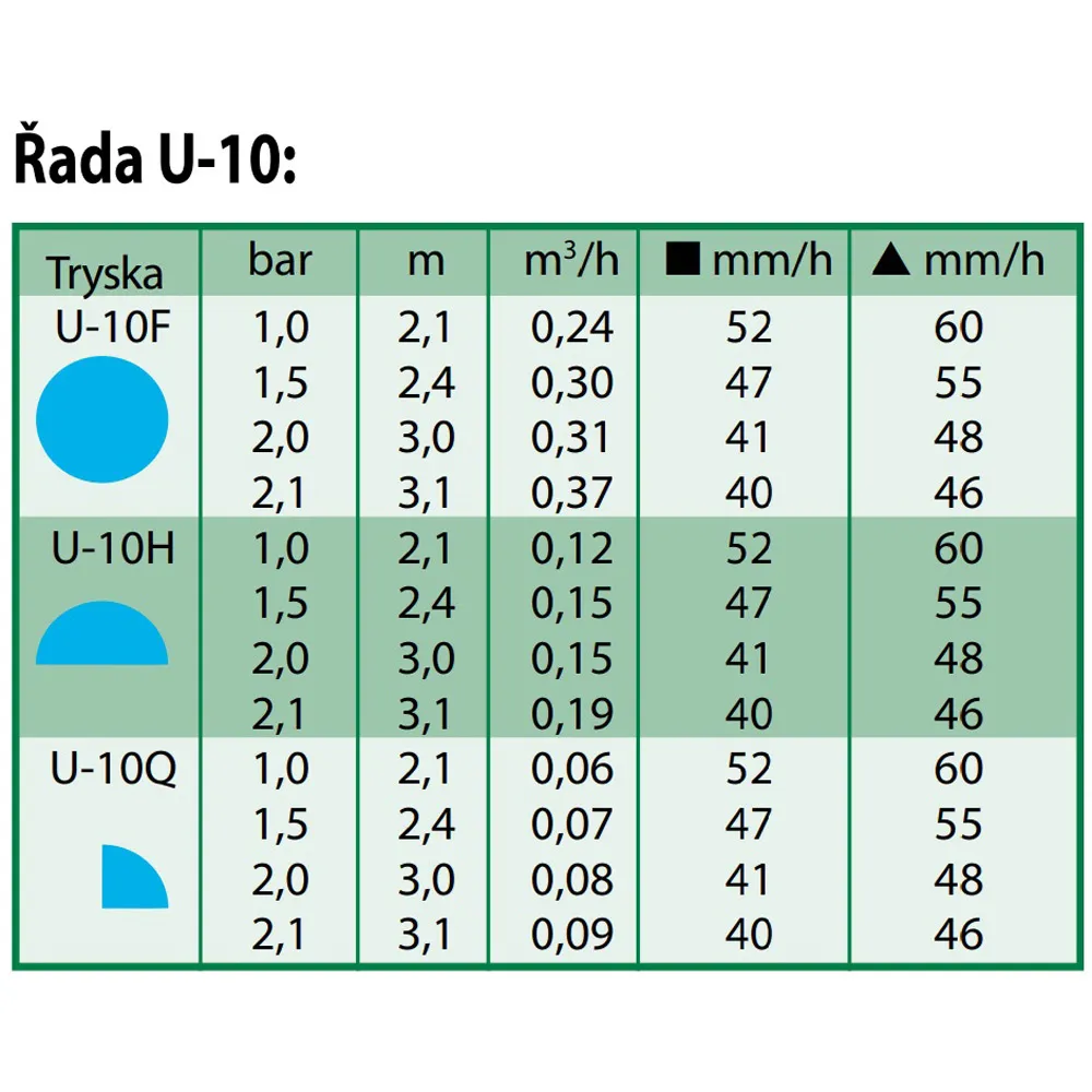 Řada U - trysky jsou první plastové trysky s druhým otvorem pro postřik v těsné blízkosti postřikovače a vylepšenou distribucí vody. Jedná se o unikátní patentované řešení, které zkracuje dobu závlahy, šetří čas a peníze a zabraňuje zbytečnému plýtvání vodou.