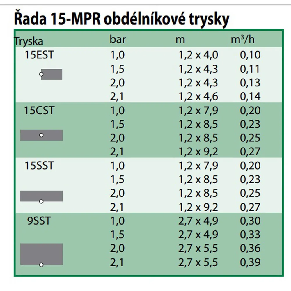 Tryska 9SST série 15-MPR obdélník ze středu, dostřik 2,7-4,9 m : 2,7-5,5 m, tryska Rain Bird