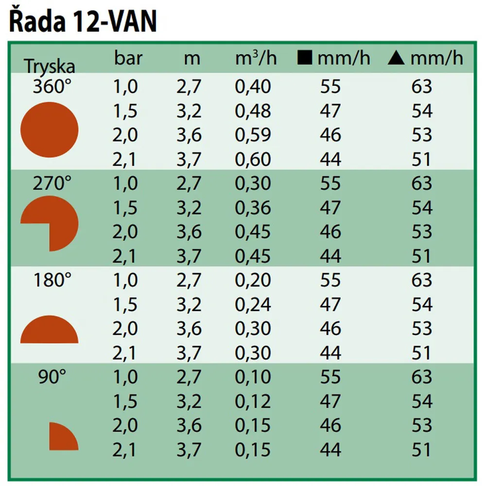 Řada  VAN - trysky jsou plastové  trysky, které jsou ideální pro zavlažování nepravidelných ploch s trávníkem nebo výsadbami, protože na nich lze snadno zvětšit nebo zmenšit velikost zavlažovací výseče. = Maximální úspora času a urychlení instalace