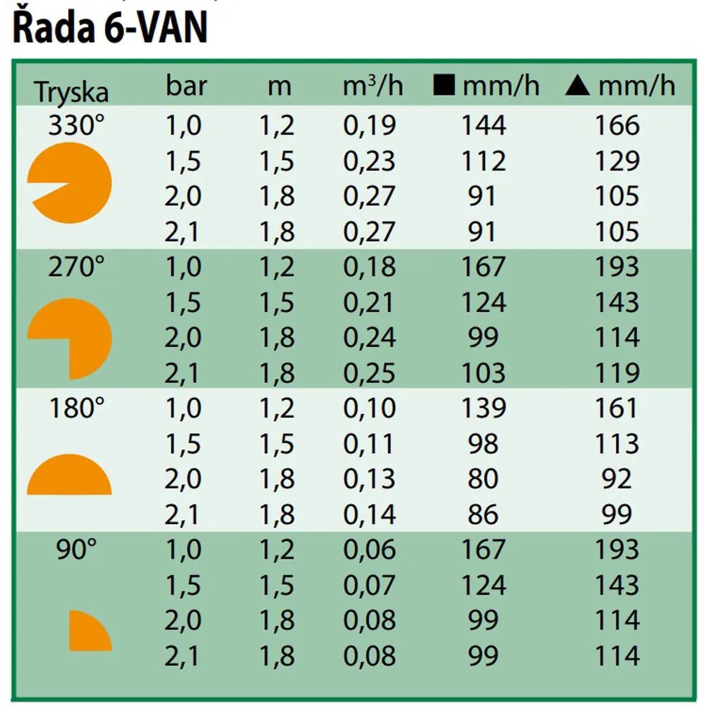 Řada VAN - trysky jsou plastové trysky, které jsou ideální pro zavlažování nepravidelných ploch s trávníkem nebo výsadbami, protože na nich lze snadno zvětšit nebo zmenšit velikost zavlažovací výseče. = Maximální úspora času a urychlení instalace