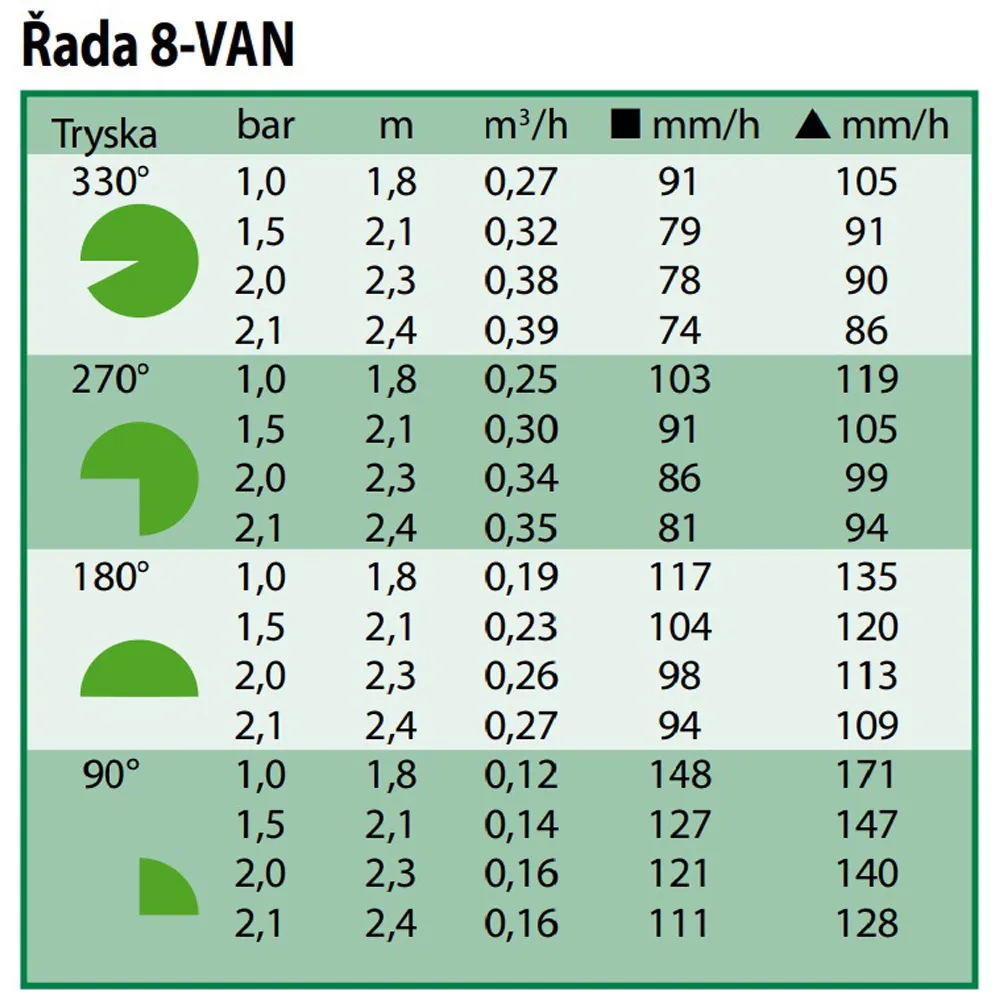 Řada VAN - trysky jsou plastové trysky, které jsou ideální pro zavlažování nepravidelných ploch s trávníkem nebo výsadbami, protože na nich lze snadno zvětšit nebo zmenšit velikost zavlažovací výseče. = Maximální úspora času a urychlení instalace