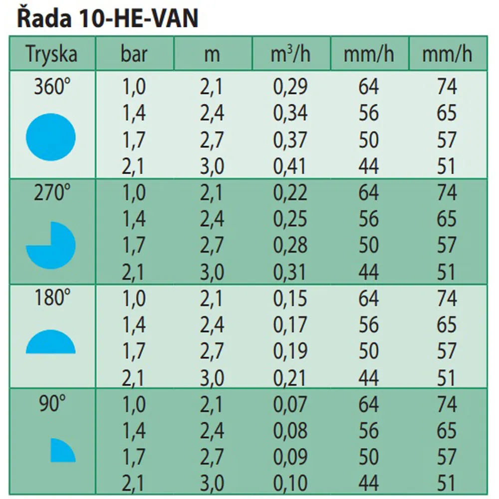 Řada  HE-VAN - jsou plastové  trysky s vnitřním závitem, které jsou ideální pro zavlažování nepravidelných ploch s trávníkem nebo výsadbami, protože na nich lze snadno zvětšit nebo zmenšit velikost zavlažovací výseče. = Maximální úspora času a urychlení instalace