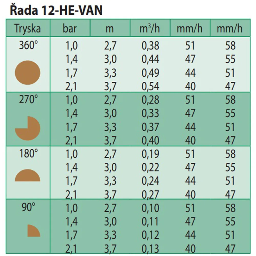 Řada HE-VAN - jsou plastové trysky s vnitřním závitem, které jsou ideální pro zavlažování nepravidelných ploch s trávníkem nebo výsadbami, protože na nich lze snadno zvětšit nebo zmenšit velikost zavlažovací výseče. = Maximální úspora času a urychlení instalace