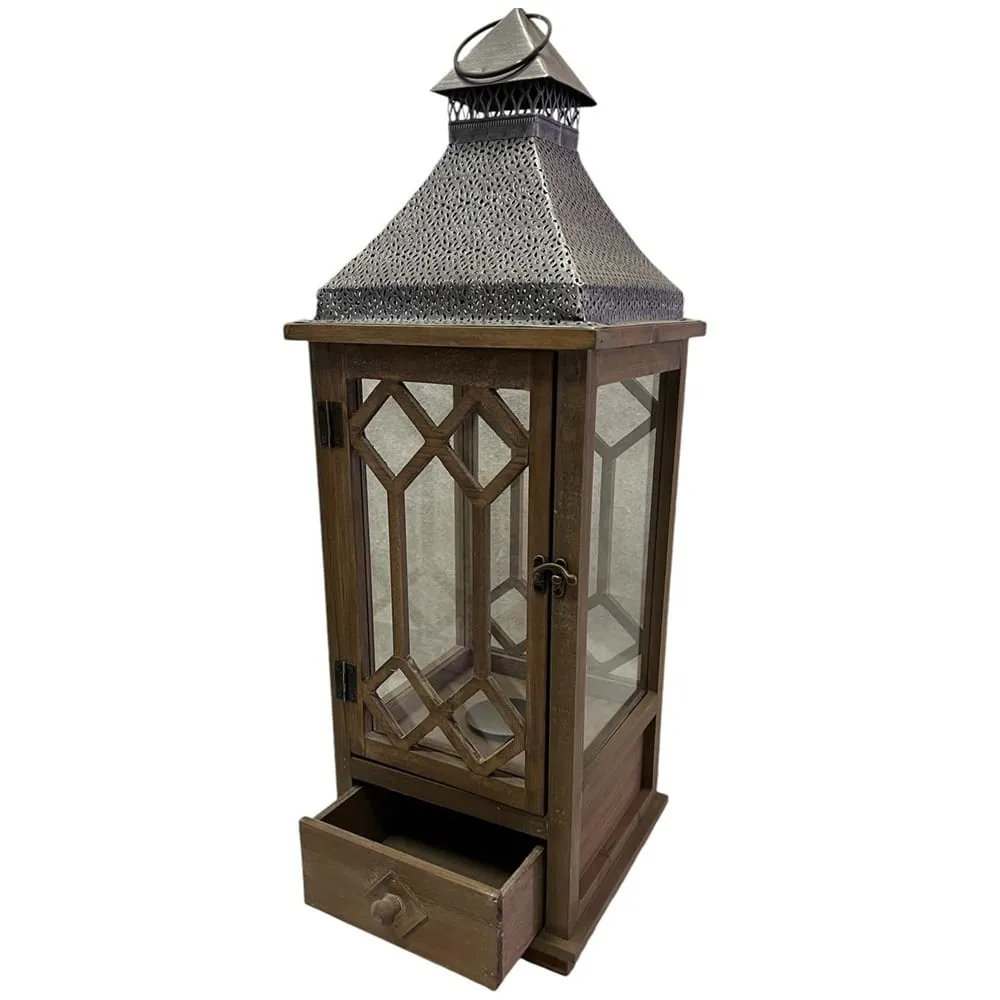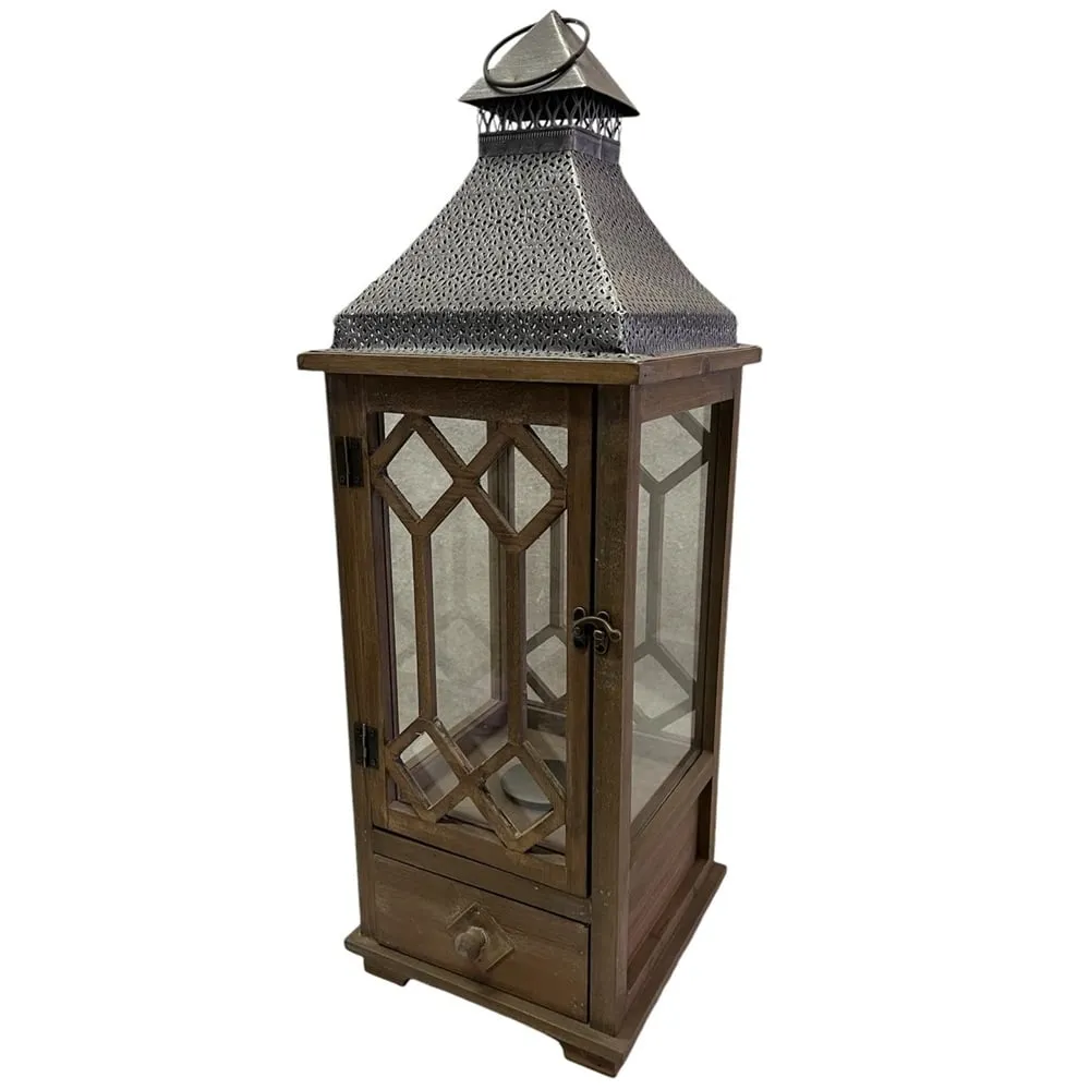 Velká dřevěná lucerna s přihrádkou 24 x 24 x 70 cm hnědá