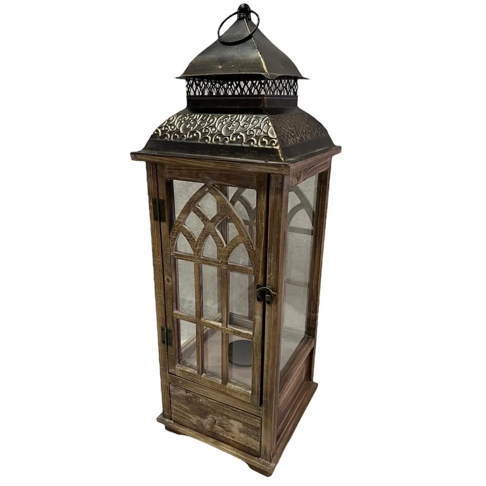 Velká dřevěná lucerna o výšce 70 cm v hnědém provedení, vybavená praktickou přihrádkou, je ideální pro dekoraci zahrady nebo terasy. Praktická přihrádka či šuplík dodává lucerně na funkčnosti a přináší stylový prvek.