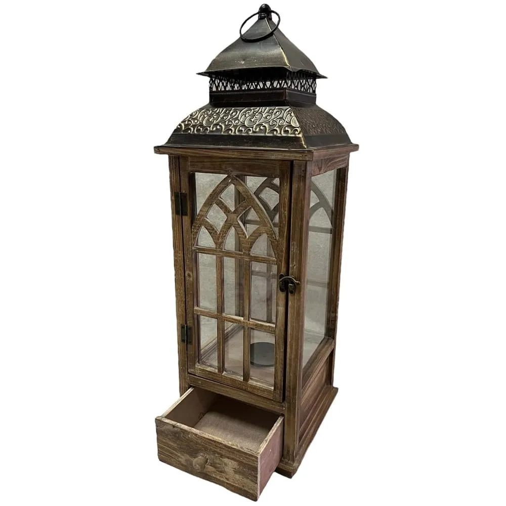 Velká dřevěná lucerna s přihrádkou 24 x 24 x 70 cm hnědá