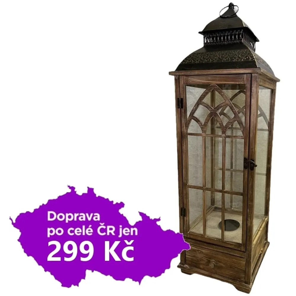 Velká dřevěná lucerna o výšce 101 cm v hnědém provedení, vybavená přihrádkou, která přináší jak funkčnost, tak styl do vaší zahrady nebo interiéru. Ideální pro venkovní i vnitřní použití.