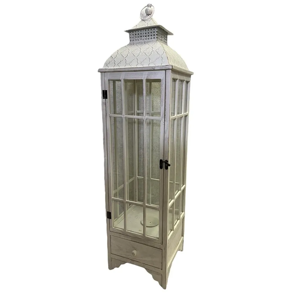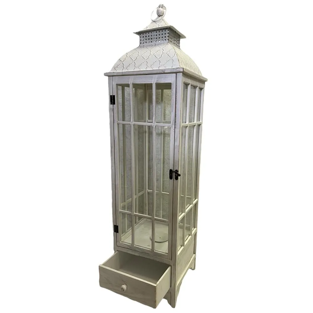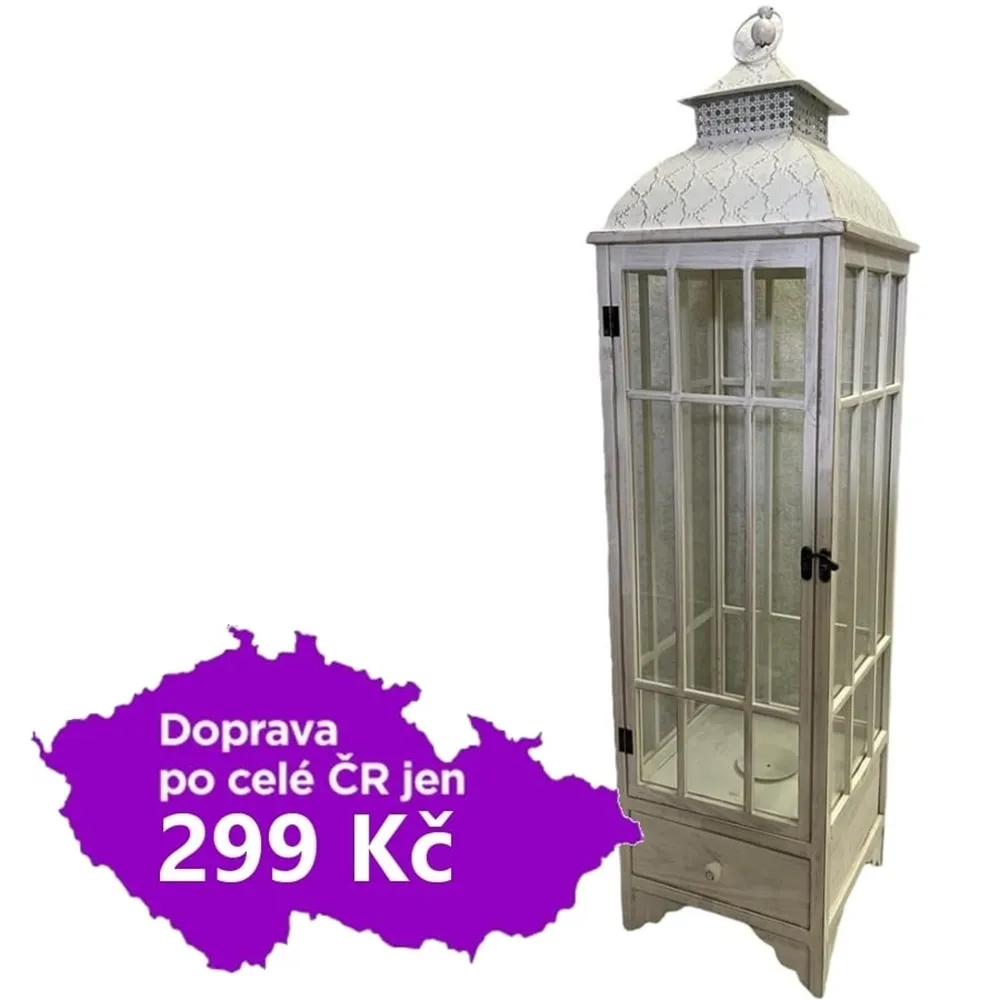 Velká dřevěná lucerna o výšce 120 cm v bílém provedení s praktickou přihrádkou, která přináší svěžest a eleganci do každého prostoru. Perfektní pro umístění na terasy, zahrady či interiéry.