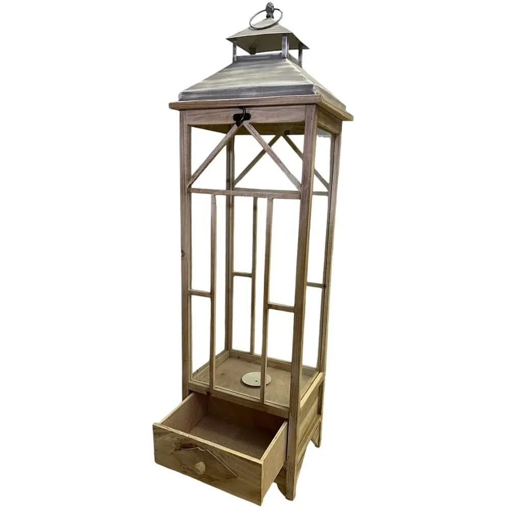 Velká dřevěná lucerna o výšce 107 cm ve světle hnědém provedení s přihrádkou je skvělou volbou pro terasy a zahrady. Vyniká svou praktickou funkcí a elegantním vzhledem.