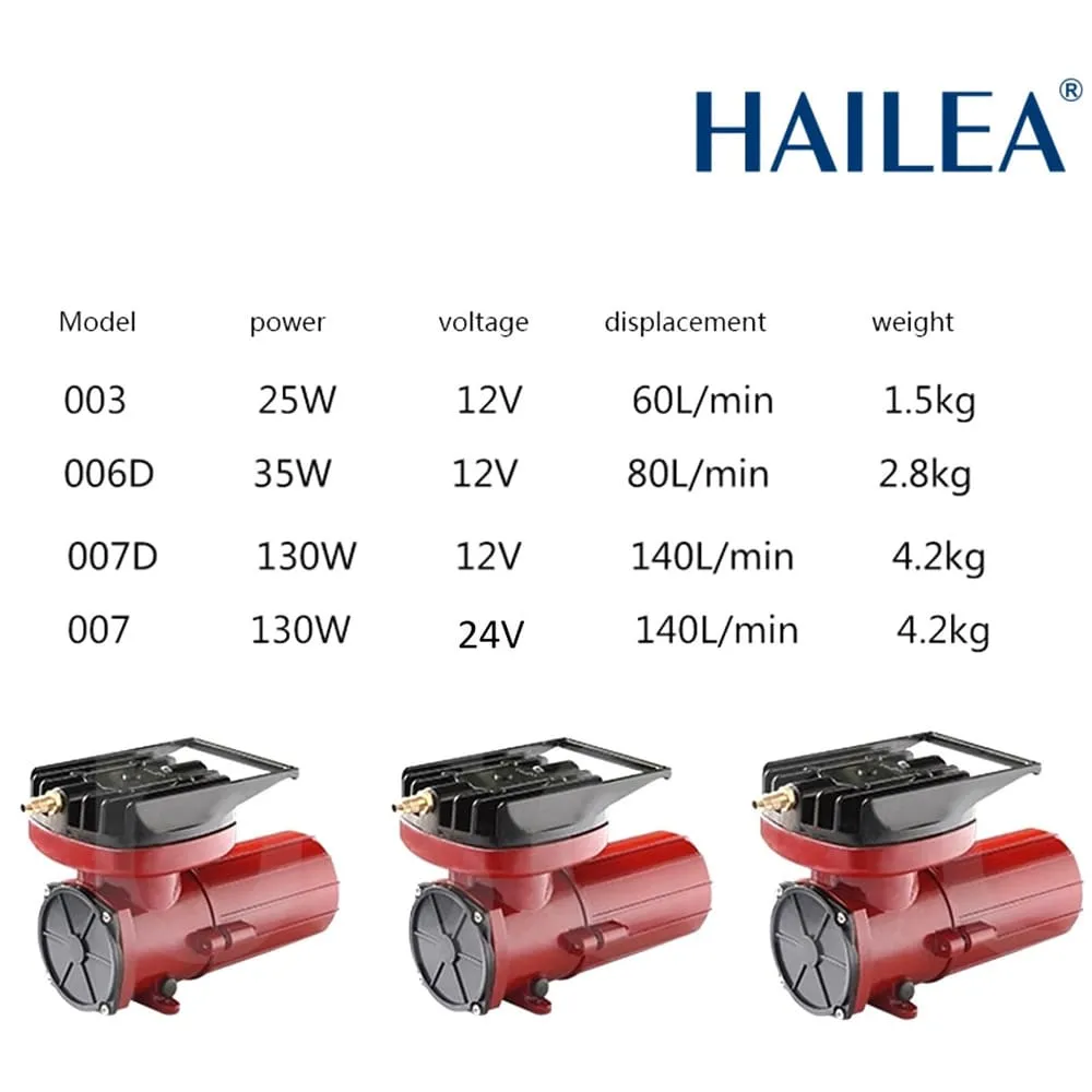 Hailea ACO-006d 12V vzduchovací pístový kompresor, je výkonný vzduchovací kompresor s nízkým napětím vhodný vhodné rybáře, odchovny ryb a převoz ryb. Pístové kompresory Hailea ACO nejsou stavěny na dlouhodobé silné zátěže, jsou vhodné pro krátkodobé použití, ideálně pro přepravu ryb.