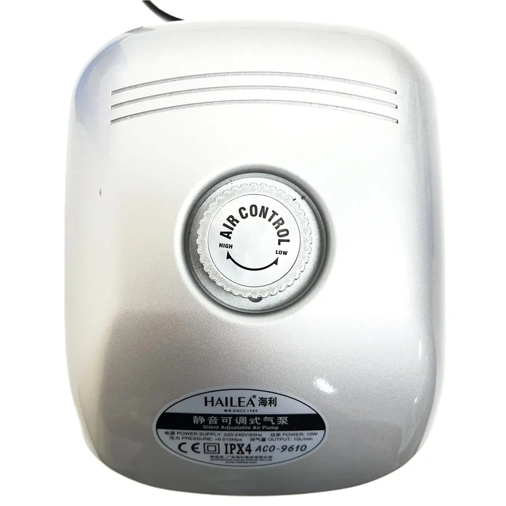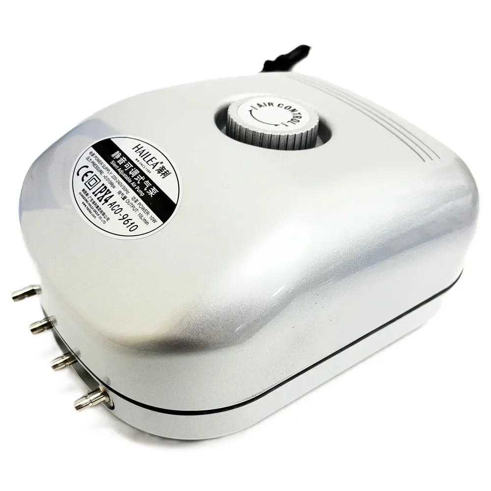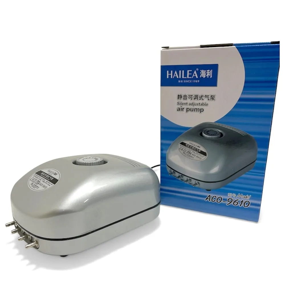 Membránový kompresor Hailea ACO 9610 slouží pro účinné provzdušnění vody v jezírkách a nádržích do 6 m³. Díky průtoku 10 l/min a pracovnímu tlaku 0,15 bar zajišťuje dostatek kyslíku pro stabilní prostředí ve vodě.