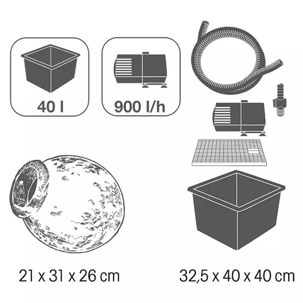 Vodopád je dodáván jako kompletní set včetně čerpadla, vodní nádrže o objemu 40 l a kovového roštu. Díky tomu je připraven k okamžitému použití bez složité instalace. Materiál z keramiky podtrhuje přirozený vzhled a dodává fontáně autentický charakter.