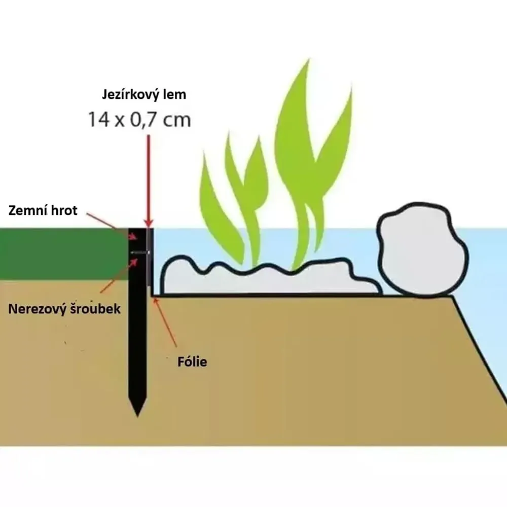 Pro pevnou a stabilní instalaci doporučujeme zatloukat hřeby zhruba po 50 cm a následně je k lemovce přichytit pomocí nerezového šroubu. Okraj krásně drží tvar a jezírko vám zůstane čisté, upravené a bez nežádoucího sesouvání.