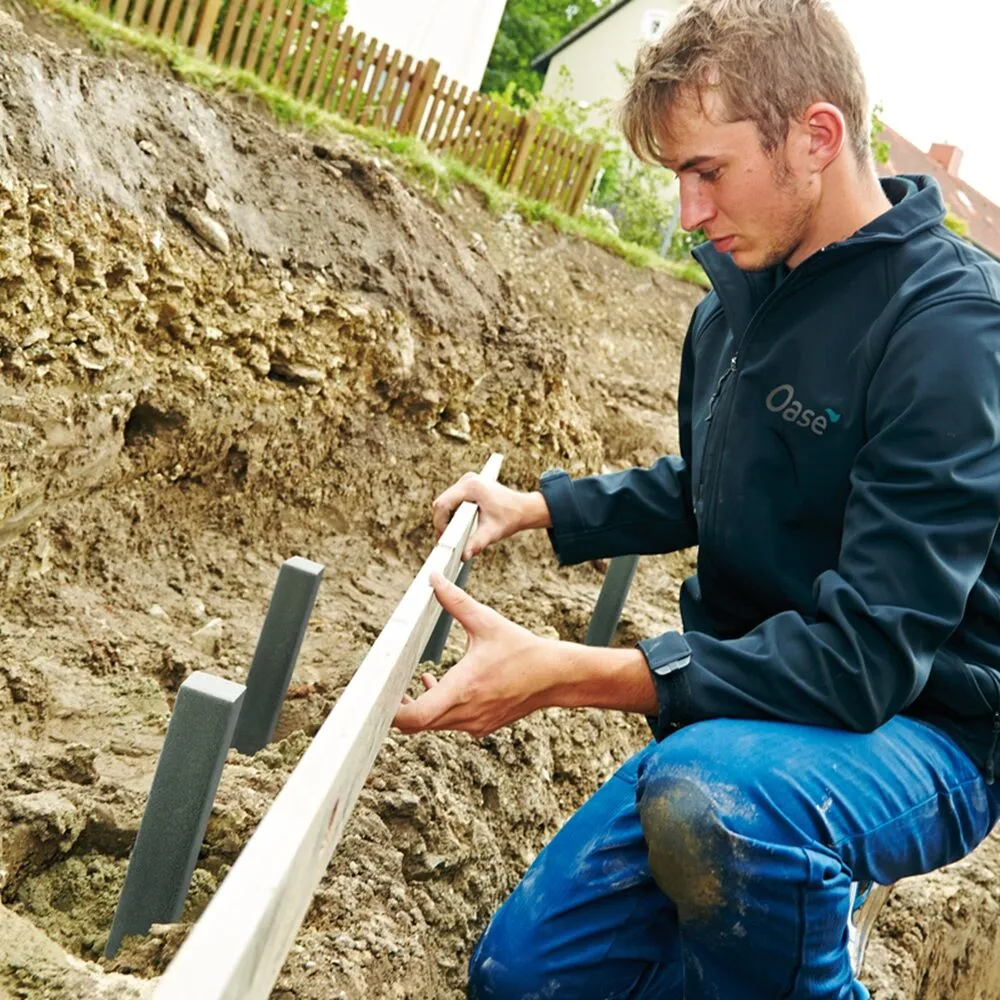 Pro optimální stabilitu jezírkového okraje nebo lemovky zatlučte hřeby do země v rozumných intervalech a připevněte je k lemovce pomocí šroubů.